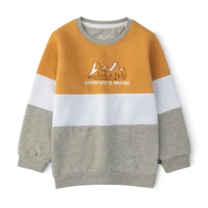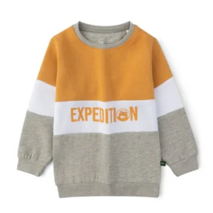 £14.00A fleece sweatshirt featuring color-block panels, adorned with graphical front, styled with a crew neck and ribbed cuffs for a cozy fit.