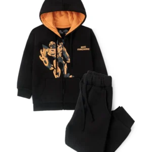 A soft fleece zip-up hoodie set featuring contrast lining, bold robot graphic, front pockets, ribbed trims, and matching drawstring joggers for everyday fashion comfort.