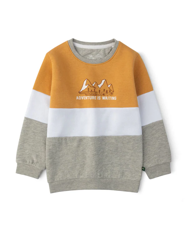 A fleece sweatshirt featuring color-block panels, adorned with graphical front, styled with a crew neck and ribbed cuffs for a cozy fit.