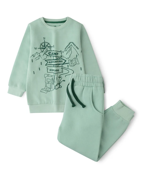 This set featuring a soft fleece sweatshirt with adventure graphics, rib-knit trims, matching joggers with an elasticated waist, and a cozy brushed interior for everyday comfort.