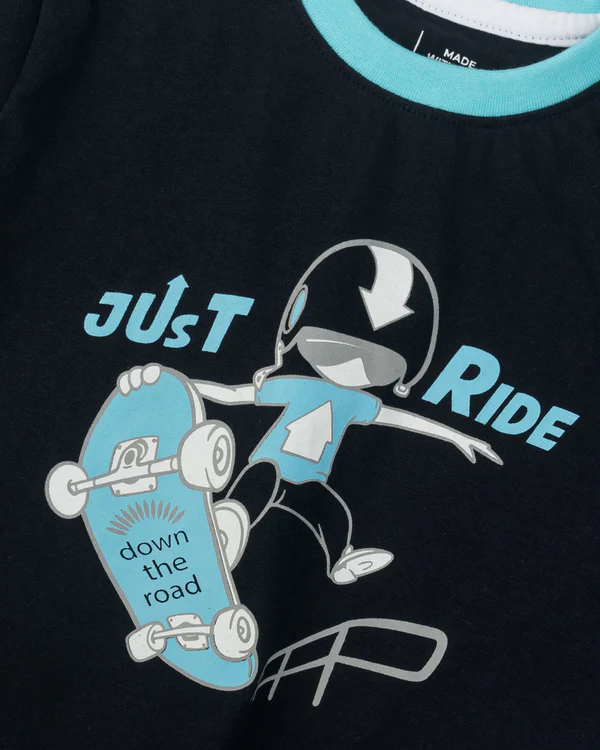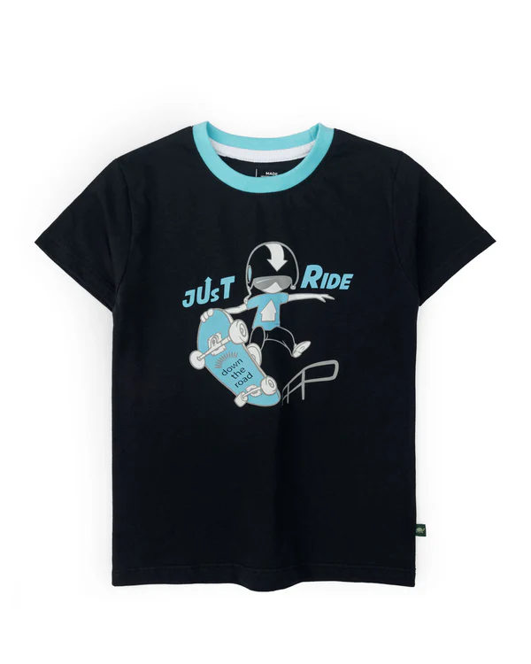 A trendy t-shirt featuring a contrast ribbed neckline, short sleeves, and an edgy graphic print for a bold, dynamic appeal.