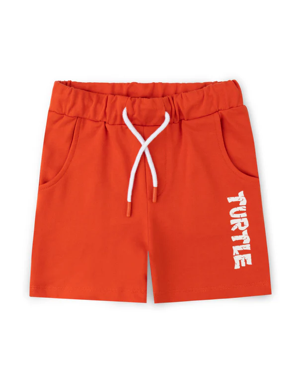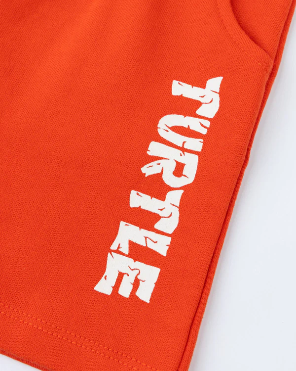 Vibrant orange jersey shorts featuring a bold signature graphics, soft elastic waistband with contrast draw cord, and functional side pockets.