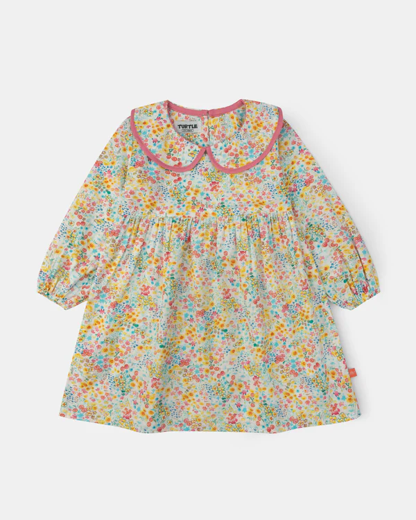 A charming cotton top featuring a floral print, full-length elastic sleeves, and a scalloped peter pan collar with contrast piping.