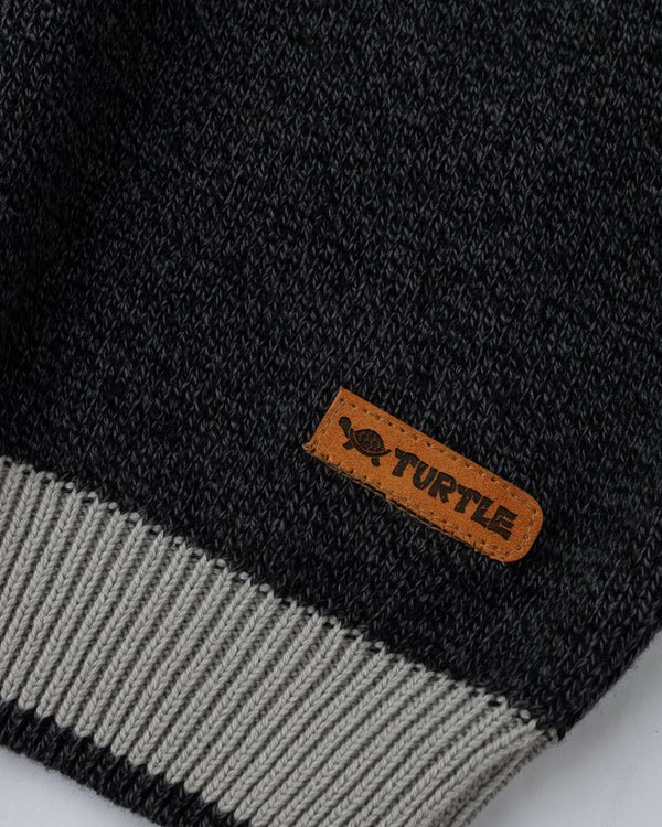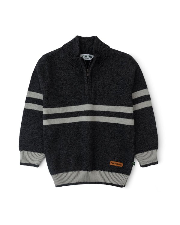 A textured half-zip knitted sweater with twin grey stripes and a subtle badge on front, finished with ribbed edges for a clean, contemporary winter look.