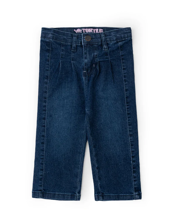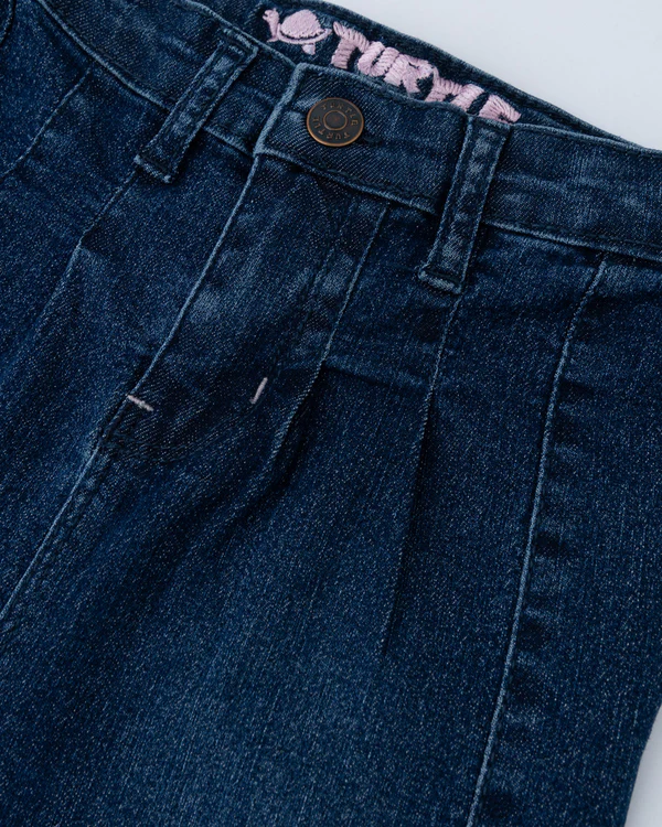 Dark blue classic denim with a zip button fly, front pleat detailing, belt loops, a structured fit, and a clean hem for a polished yet casual look.