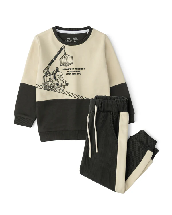 A fleece-crafted duo-pack with a graphic sweatshirt and joggers with sporty side panels, designed for comfy all-day play.