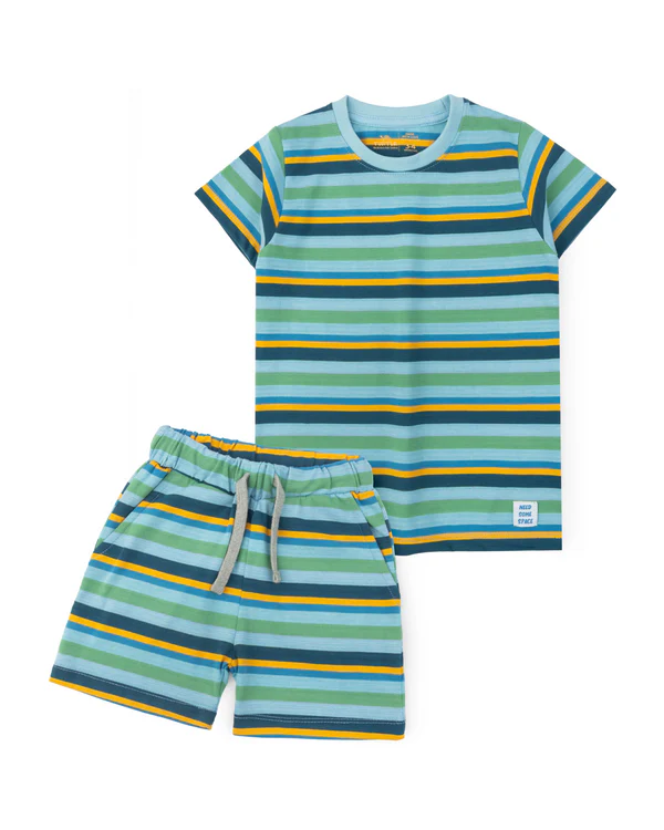 This striped tee with a hem patch, teamed with easy-fit shorts designed with a functional drawstring, elastic waist, and side pockets.