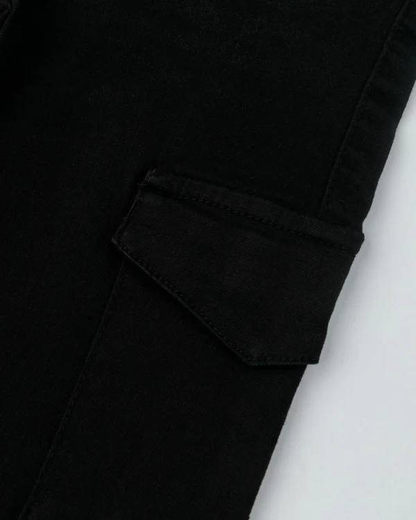 A sleek black utility denim featuring a statement cargo pocket, durable texture, and a modern straight-cut profile for a bold, street-smart look.