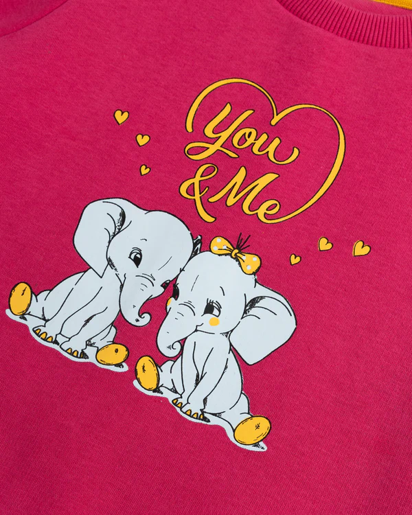A cozy fleece-crafted tracksuit featuring a printed sweatshirt with a pocketed front, paired with elasticized trousers for a comfortable and easy-on fit, perfect for casual wear.