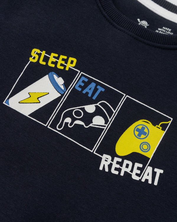 This suit is made of terry fabric is designed in printed pattern with ribbing details on sweatshirt and complete the look with elasticized waist trouser.