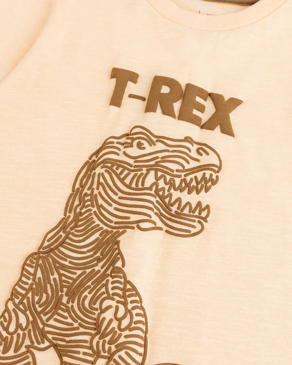 Rock a peachy vibe with this jersey crafted t-shirt, front features fierce T-Rex graphics, adding a playful and bold touch to your summer look.