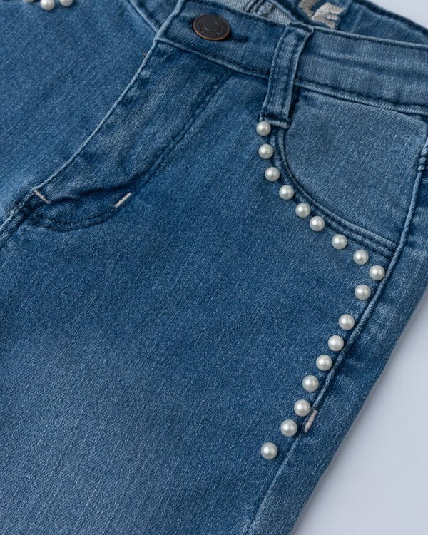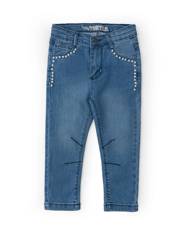 This blue denim with a zip button fly, pearl-embellished pockets, decorative front stitch details and slim fit pattern, for a stylish and elegant look.