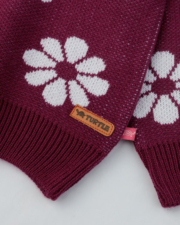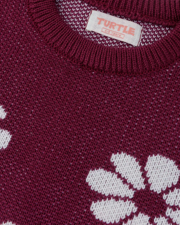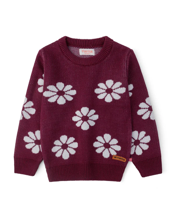 A dark-toned floral knit crafted with cozy texture sweater, featuring relaxed fit, ribbed trims, and a leather brand patch for adding a playful yet polished touch.