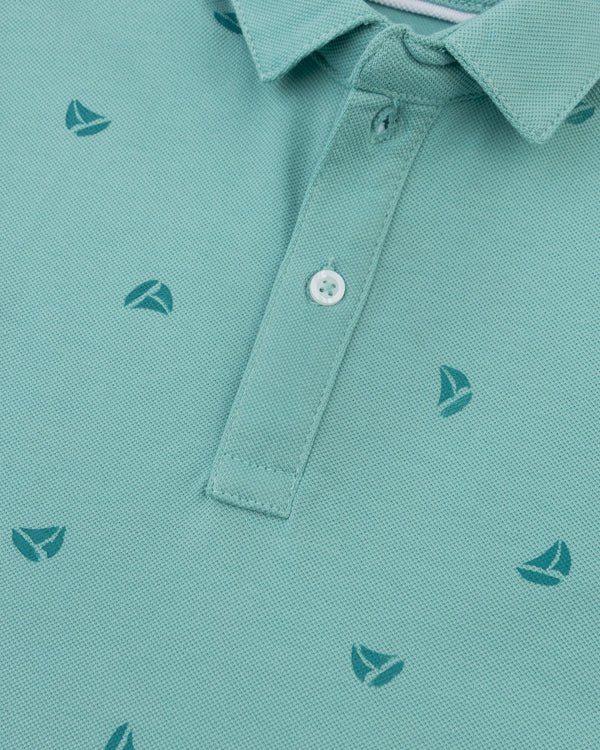 This polo with a classic collar, short sleeves, and a two-button placket, featuring an all-over print on breathable soft fabric for a casual nautical look.