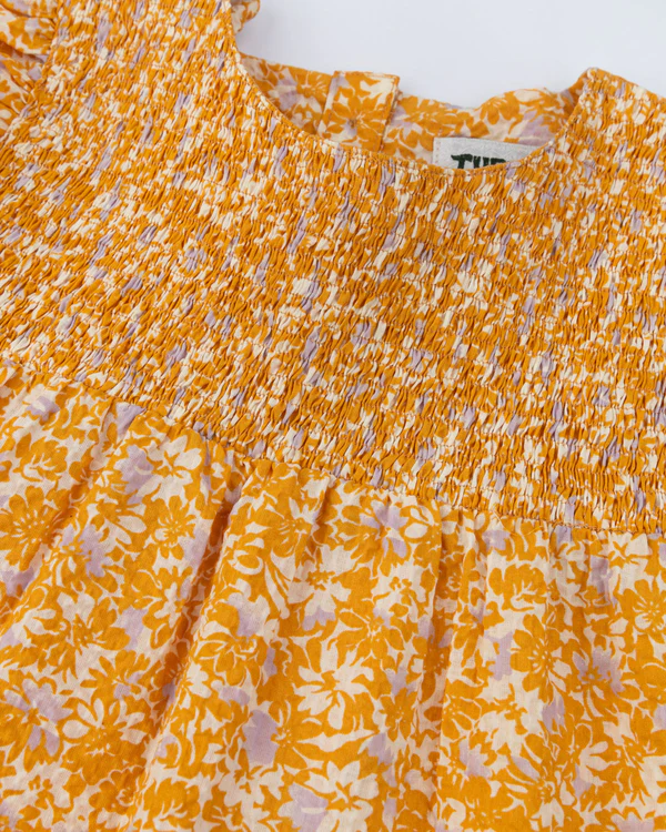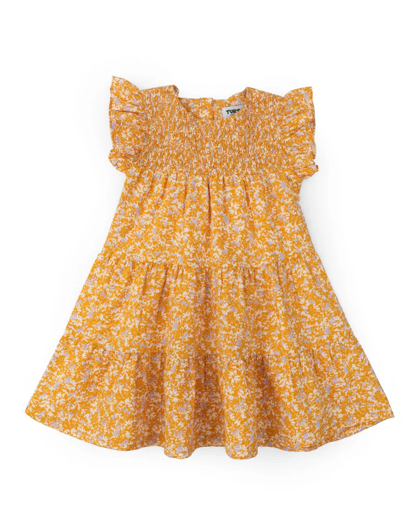 A breezy tiered top crafted from cotton fabric, featuring delicate floral prints, a smocked bodice, flutter sleeves, and a flowy silhouette for effortless charm.