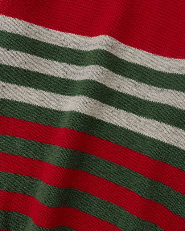 A cozy knit sweater featuring bold horizontal stripes, crafted in a soft, warm yarn with ribbed cuffs, hem, and neckline for a snug winter-ready fit.