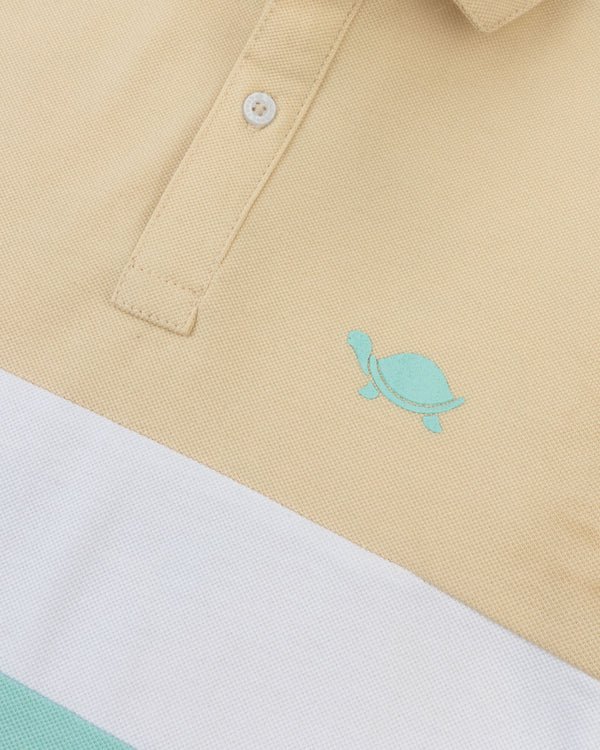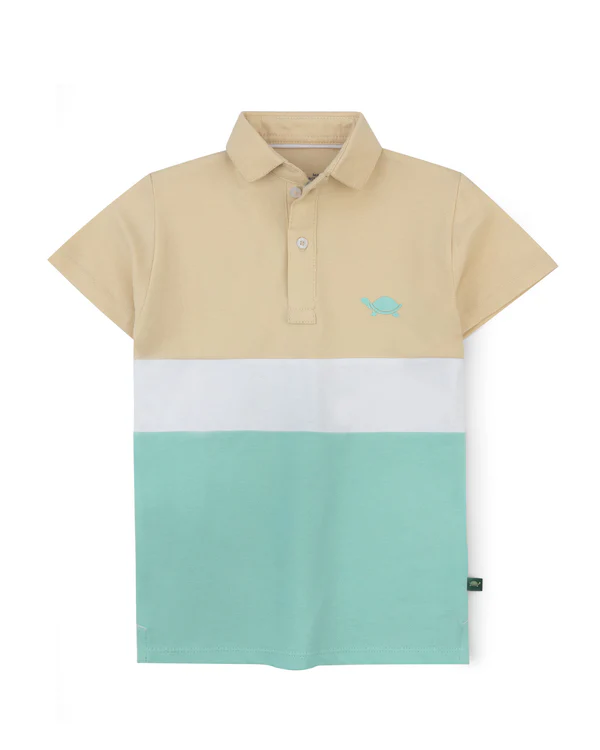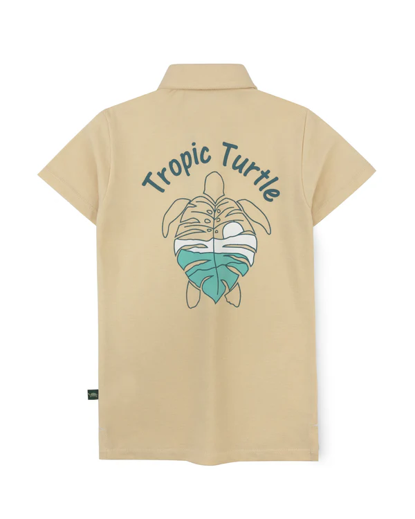 This polo combines comfort with a refined color-block design, featuring a signature logo detail on the chest and a bold tropical graphic on the back.