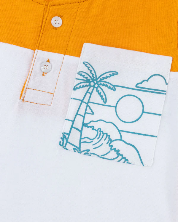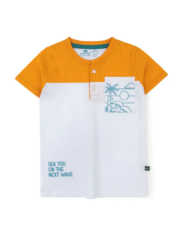 T-shirt crafted from soft jersey fabric, features a two-tone color block design, a graphic chest pocket, and a hemline print for a laid-back vibe.